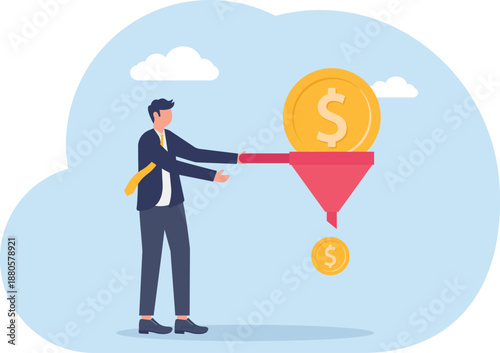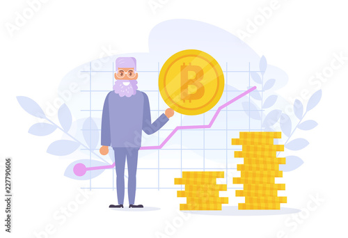 Vector illustration of businessman juggling gold coins with cryptocurrency symbols. Business and finance concept design element.