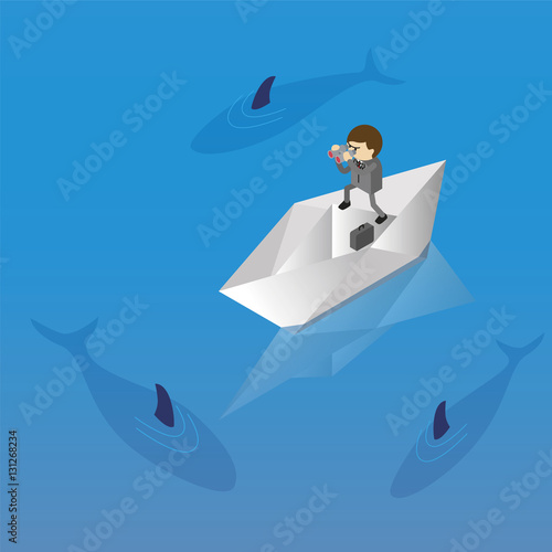 Businessman looking through spyglass on paper origami boat floating in sea with sharks. Business risk and search for opportunities concept