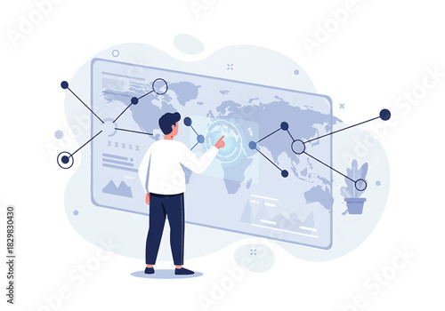 Business man looking through telescope standing on coin stack, flat vector illustration. Business leader, career growth, future vision, financial success.