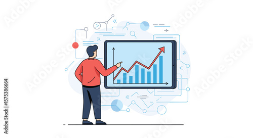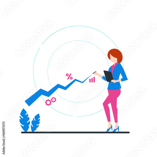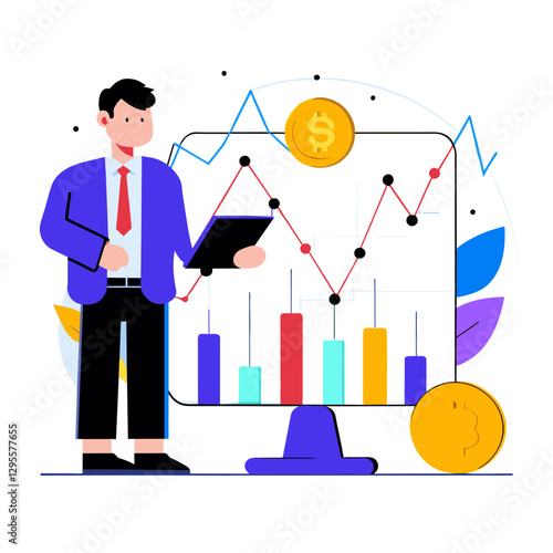 Business man looking through telescope standing on coin stack, flat vector illustration. Business leader, career growth, future vision, financial success.
