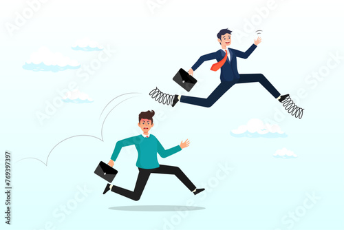 Businessman running to work, vector flat style design illustration. Young man wearing suit, holding briefcase in one hand and document in the other. Business concept for web banner, website page etc.
