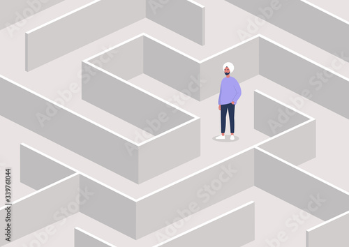 Businessman standing in front of maze with solution to success vector illustration. Hard path to big boss, career growth and leadership concept