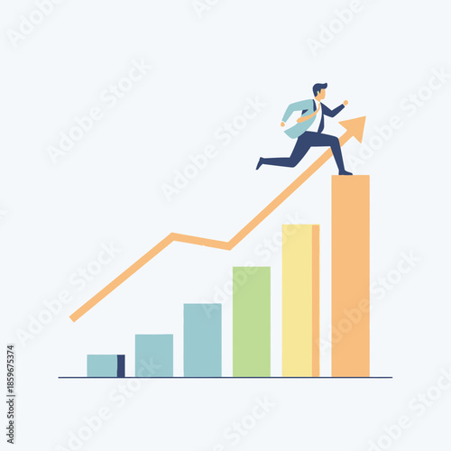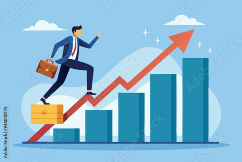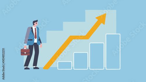 Businessman standing on the top of revenue growth increasing graph, flat vector isometric illustration. Sales increases, income, profit growth.