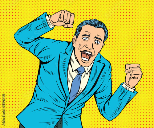 Businessman talking by phone and reading documents. Vector illustration in retro pop art comic style.