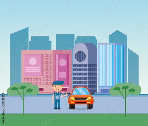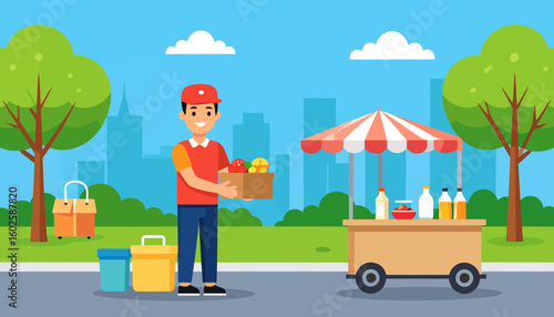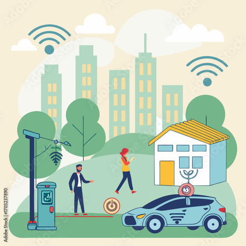 Happy businessman with briefcase commuting to work by electric unicycle, flat vector illustration. Self balancing one wheel electric scooter. Eco friendly city transport.