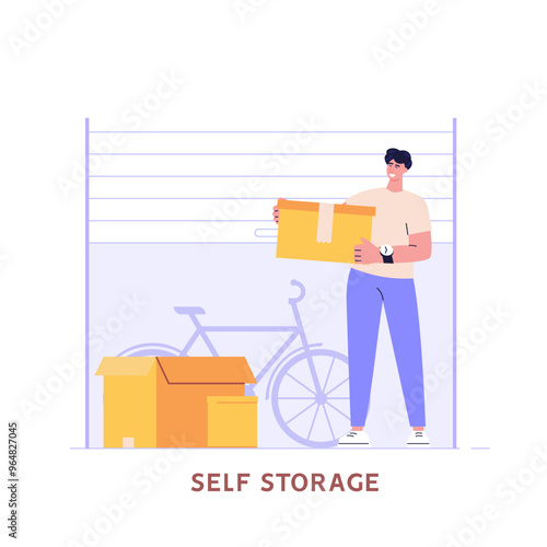 Modern office workplace. Businessman working on laptop computer while standing at high office desk, flat vector illustration. Business workspace with high tables office furniture.