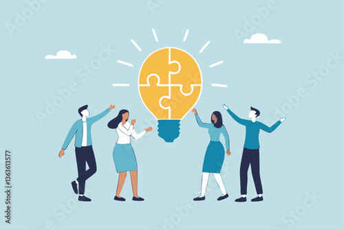 Vector illustration of two businessmen collecting puzzle of electric light bulb. Creating ideas and teamwork concept design element.