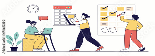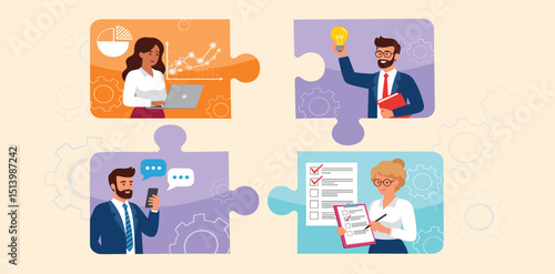 AI in business scene set. Businesspeople interacting with artificial intelligence vector illustration. Futuristic robot assisting employees with creative image, searching files, generating idea