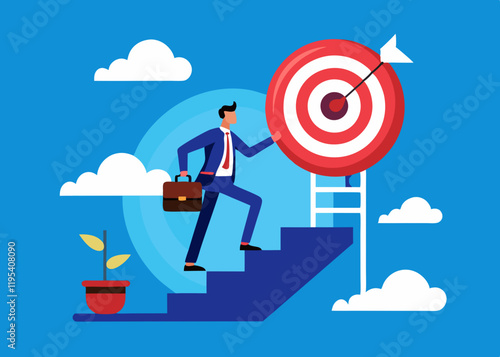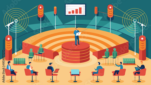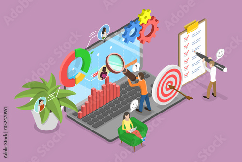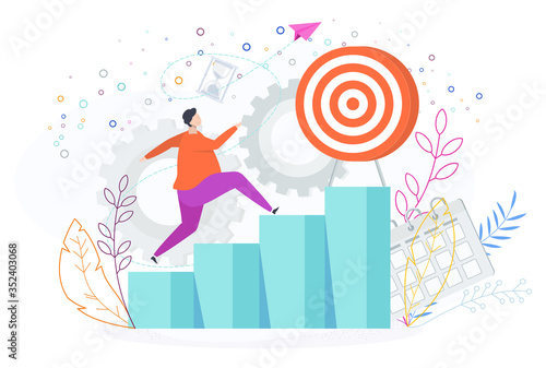Busy employees doing tasks, holding pie chart, megaphone, target, calendar, flat vector illustration. Office people engaged in work. Efficiency, productivity, task management.