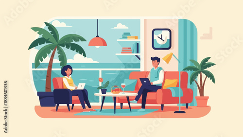 Vector illustration of woman buying tropical exotic fish. Pet shop interior. Flat style design elements.