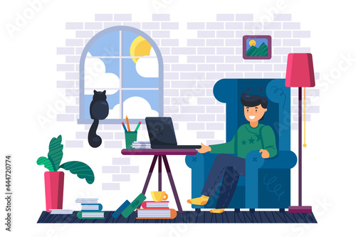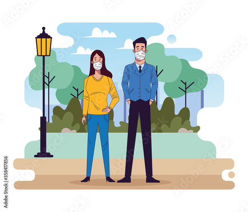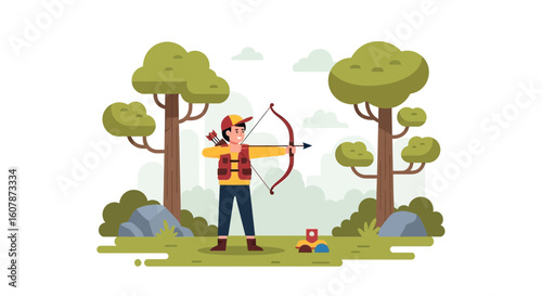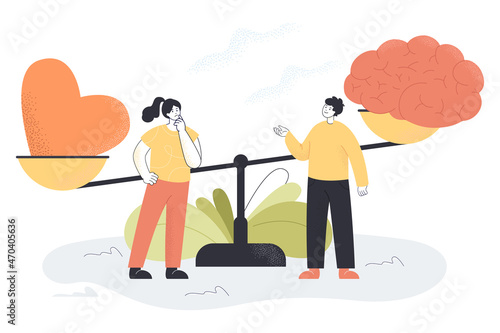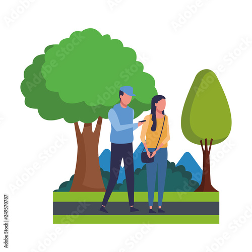 Cafe in the mountains. Happy couple drinking mulled wine, flat vector illustration. Young man in Santa hat and woman celebrating New Year and Christmas holidays outside the city. Winter vacation.
