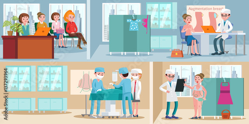 Cafe or bar scene set with staff and visitors, flat vector isolated illustration. Coffee shop, coffeehouse counter with menu. Modern restaurant interior with people.