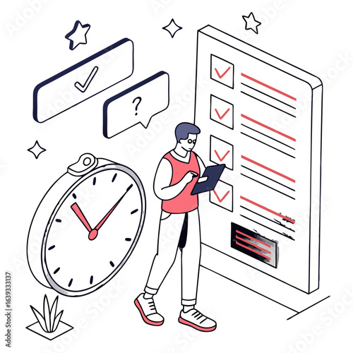 Huge calendar with stickers, check marks and micro characters scheduling, planning work, vector flat style design illustration. Calendar planner, event schedule concept.