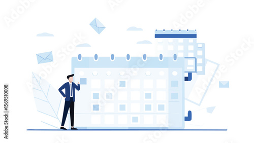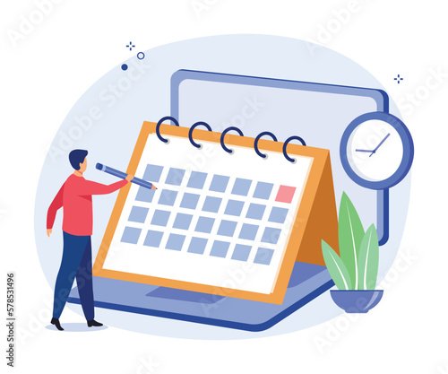 Calendar with tax deadline check mark, tiny characters filing tax form, making payments, flat vector illustration. Tax day reminder, taxation concept.