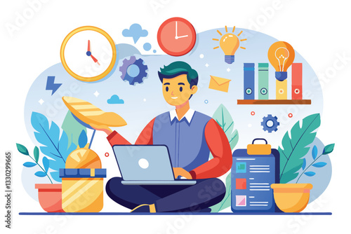 Call center operator using headset to talk by phone. Customer service concept vector illustration. Black man works in call center. Office desk with computer, online call, video conference.