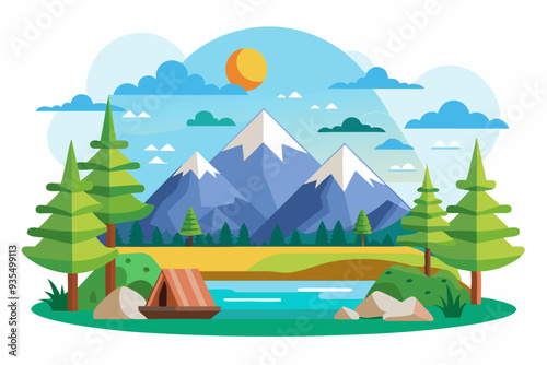 Mountain camp origami paper cut art vector. Summer travel background craft 3d landscape. Mount, fir tree forest and tourist tent design illustration