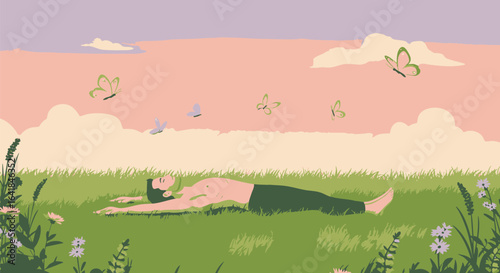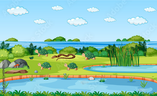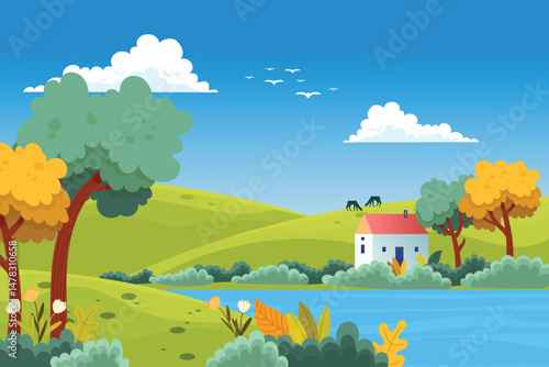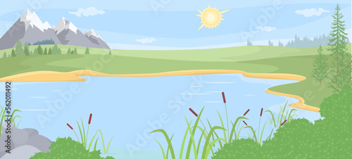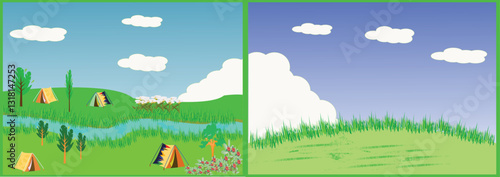 Summer camp in mountain valley at river bank vector illustration. Happy people tourists living in tents, travel trailers and camper vans, cooking and eating food outdoor, playing, talking each other