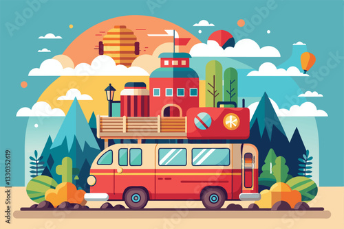 Camper van with bicycle on a roof. Travel and camping isometric vector illustration in flat 3d style. Outdoor camp activity. Travel by caravan car.