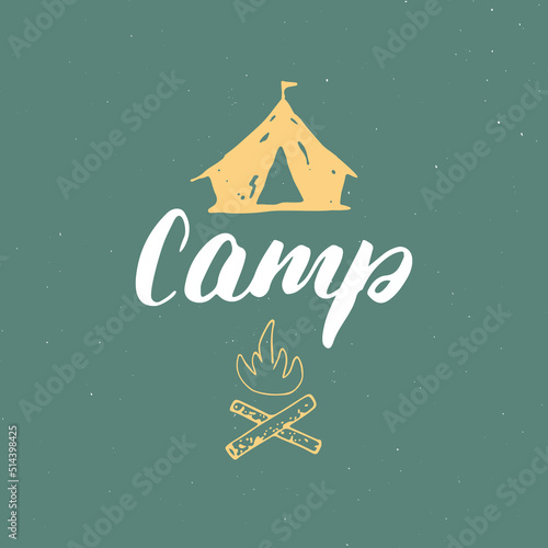 Camping club logo. Outdoor recreation vector emblem. Vintage badge with tent, bonfire at night landscape. Retro badge isolated on white background
