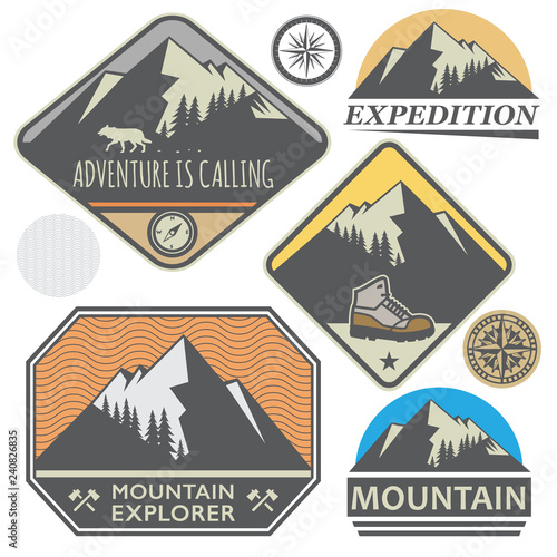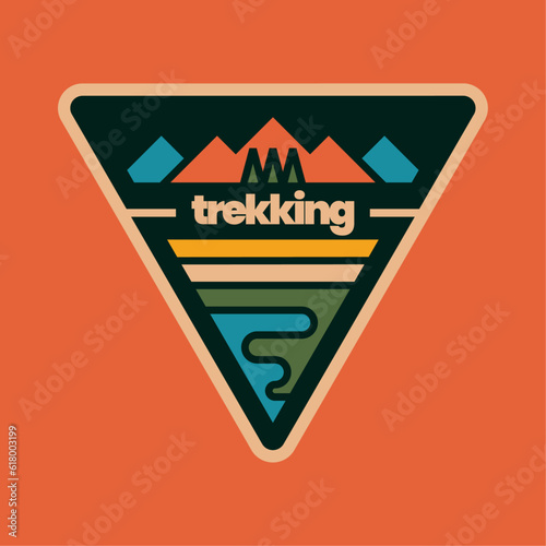 Camping club vector logo. Vintage camp label. Adventure and travel in mountain isolated on white background. Tent on forest and rock range landscape. Outdoor expedition and tourism emblem