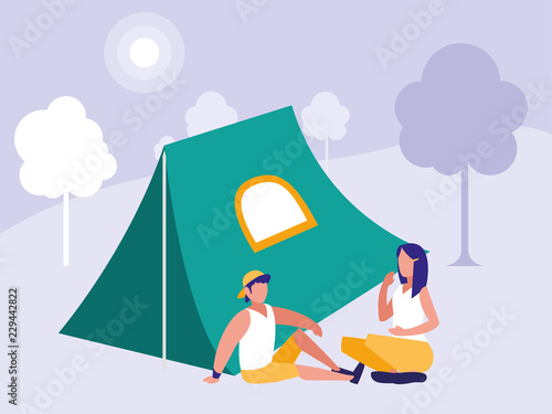 Vector illustration of tourist male standing next to tent and watching through binoculars. Camping concept design element in flat style.