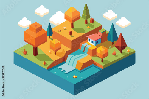 Camping isometric concept. Vector illustration in flat 3d style. Outdoor camp activity. Travel by camper in mountains.