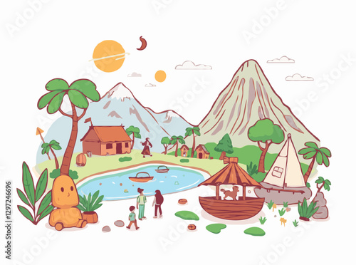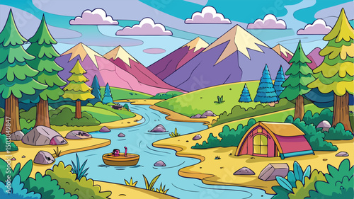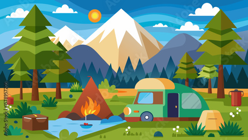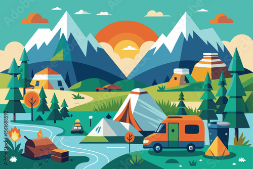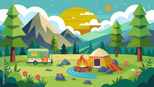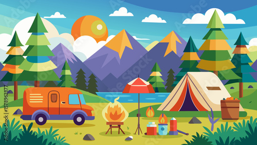 Camping site with tent, bonfire and camper van with mountain and lake landscape on background. Summer camp vacation vector illustration. Adventure, nature, campfire.