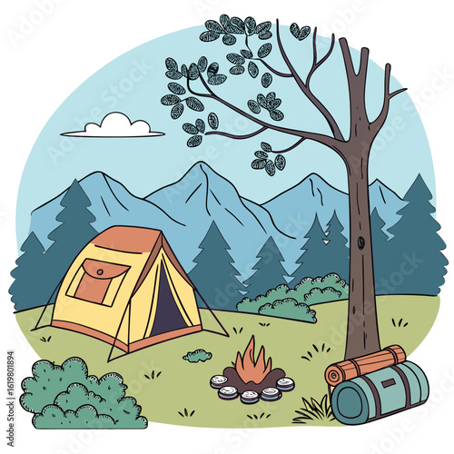 Camping site with tent, bonfire and camper van. Summer camp vacation vector illustration. Forest landscape with camping equipment. Adventure, nature, campfire.