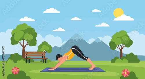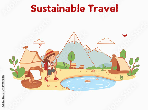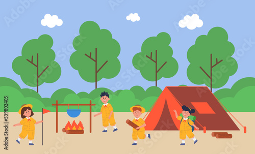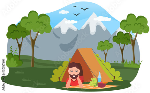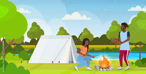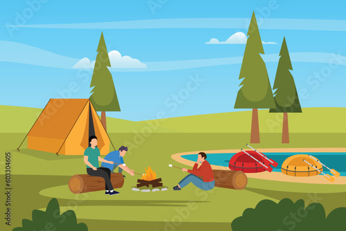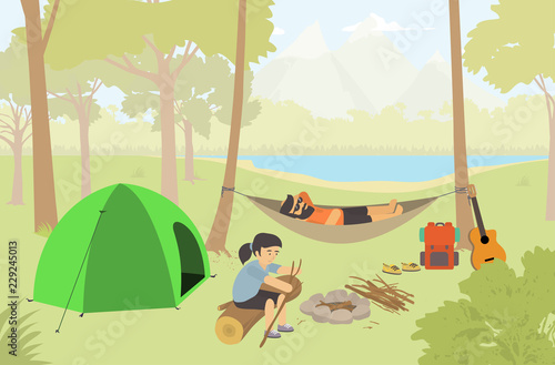 Camping vector illustration. Happy touristic family rest on nature. Woman cooking food on bonfire, man fishing in river, parent and kid playing guitar and singing at campfire illustration