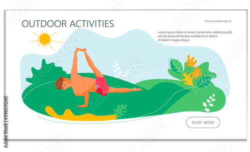 Camping website and mobile app onboarding screens. Menu banner vector template for web site and application development. Camping gear and supplies. Tent, fire, chop woods, hygiene products, baggage.