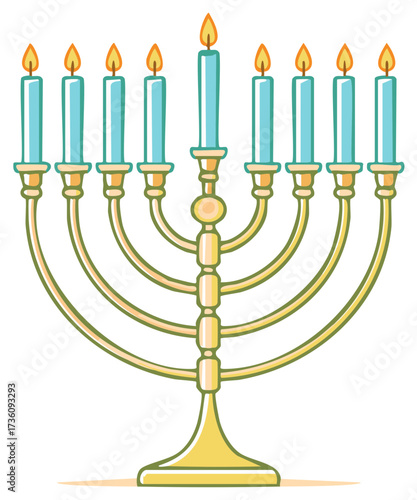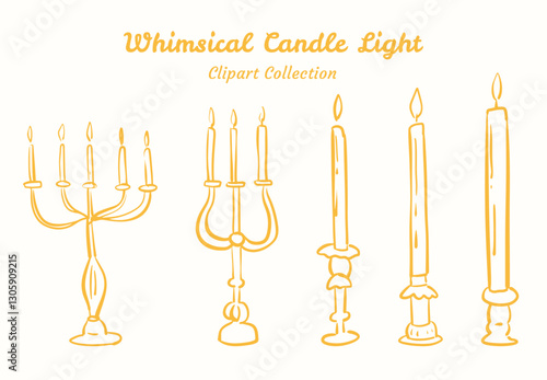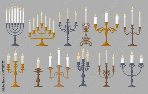 Candlestick with one, two, three and seven burning candles set. Vector realistic illustration isolated on transparent background.