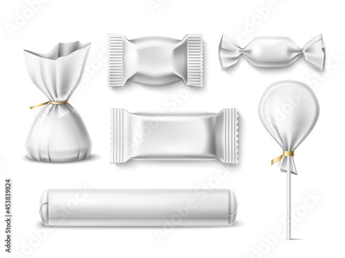 Candy packaging mockup set, vector isolated illustration. Realistic white and transparent blank plastic foil food snack pack for candy, chocolate bar etc.