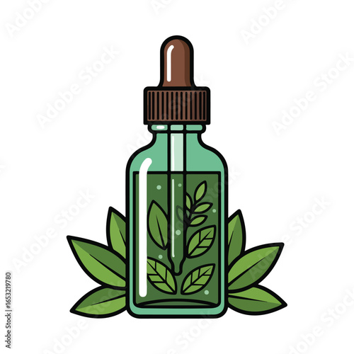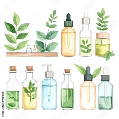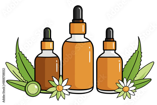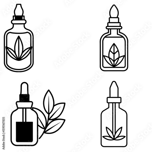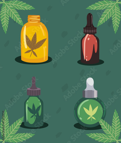Cannabis oil set. Vector realistic illustration of plastic and glass bottles of hemp oil with cannabis plant leaves.