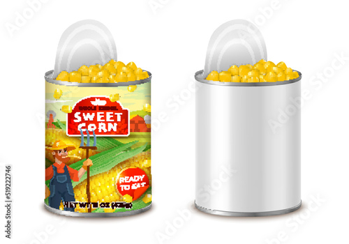 Canned sweet corn organic product package mockup set, vector illustration isolated on white background. Realistic opened tin cans with label and without it.