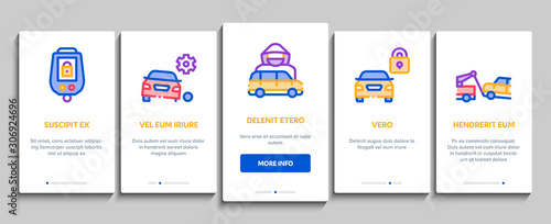 Car breakdown. Female driver fixing broken car. Spare wheel, toolbox. Mobile app onboarding screens. Vector banner template for website and mobile development. Web site and UI design illustration.