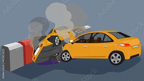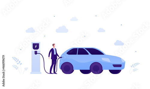 Car service and repair vector concept illustration. Mechanics fixing or replacing broken car door and tire. Auto dody repair shop concept for web banner, website page etc.