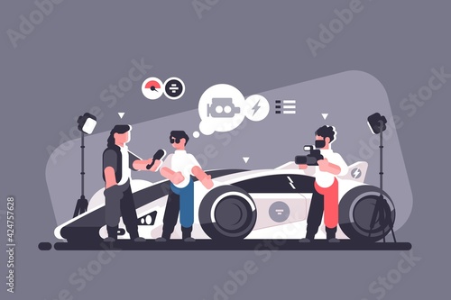 Car refueling at petroleum station, flat vector illustration. Driver with piggy bank, money, credit card. Fuel petrol gas filling station worker with gasoline pump hose.
