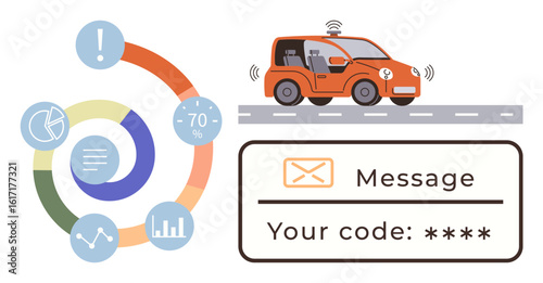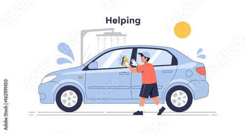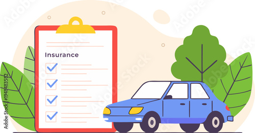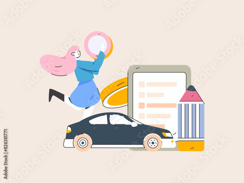 Huge car rental agreement, red auto and micro male and female characters with passport, key and pen, vector illustration. Car rent, automobile leasing concept for web banner, website page etc.