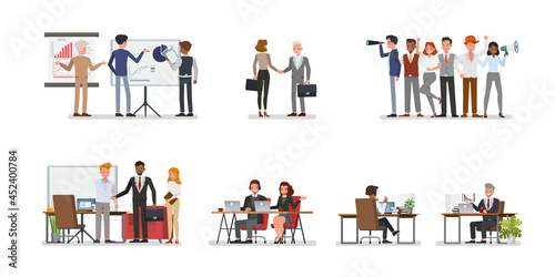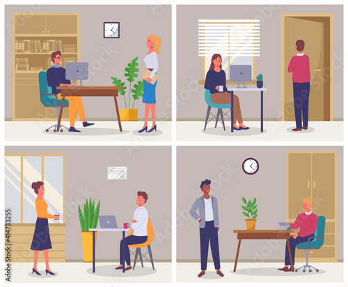 Car repair service and auto mechanic garage. Cartoon vector posters set. Man fix broken car and change tires and oil. Auto tuning workshop. Mechanic talks to customer.