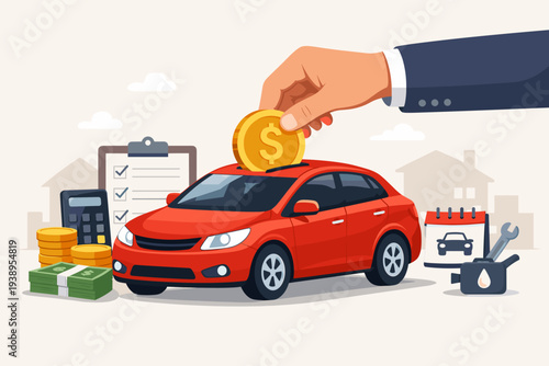 Car sale vector illustration. Customer buying car from dealer concept. Salesman giving key to new owner. Hand holding money.