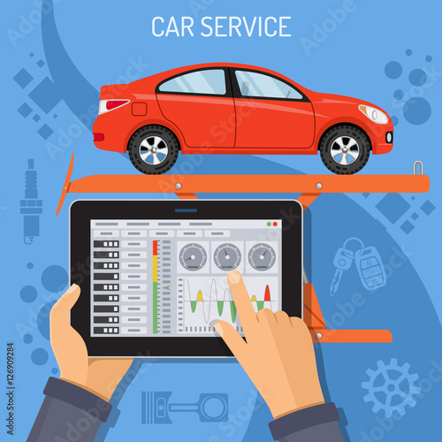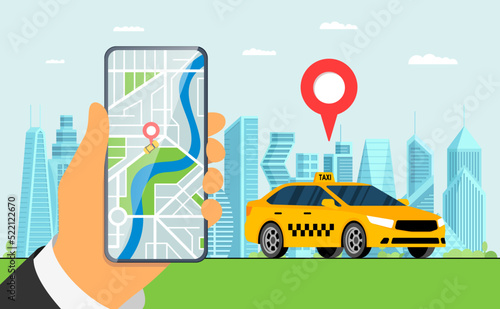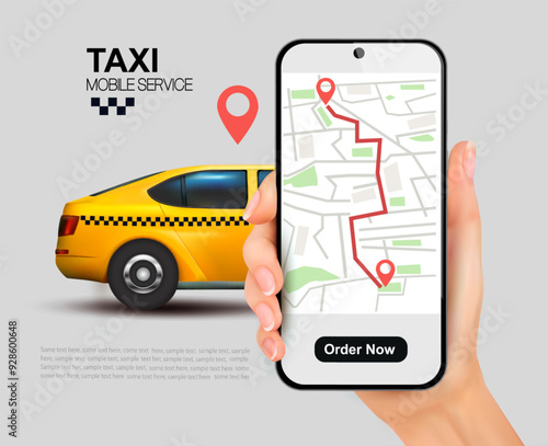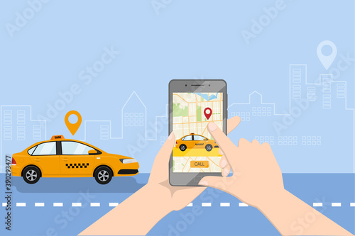 Carsharing vector web banner template. Smartphone in human hand, isometric cars for rent in parking area and man with mobile phone in front of them. Carpooling service, car sharing mobile app concept.