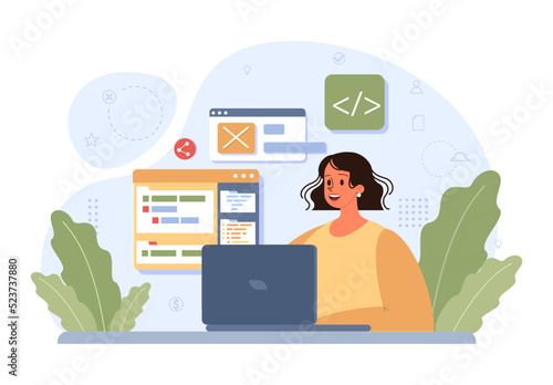 Vector illustration of young woman receptionist standing at reception desk. Car shop reception flat style design element.