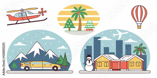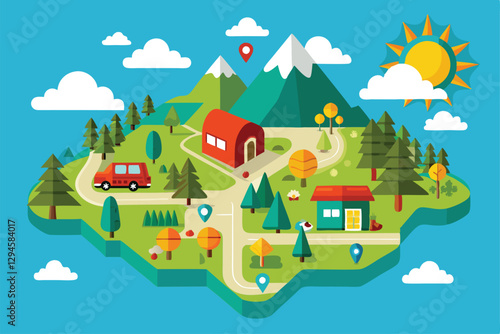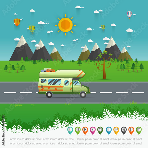 Car travel and camping isometric concept. Vector illustration in flat 3d style. Outdoor camp activity. Travel on camper.