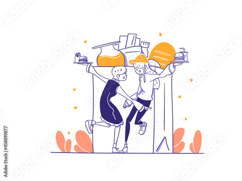 Caring for elderly concept vector flat illustration. People taking care of senior woman buying food, walking the dog, cleaning house, helping with money. Care and support for seniors, volunteering.