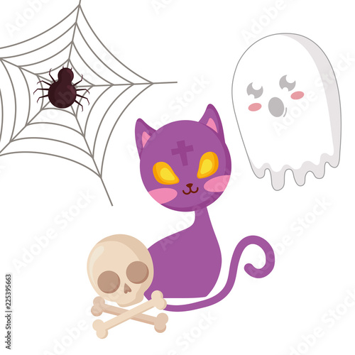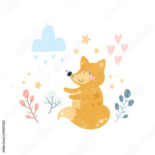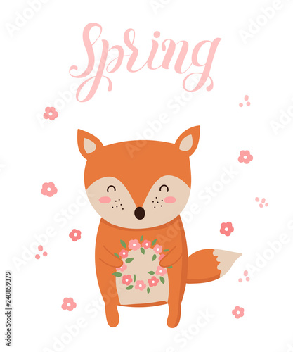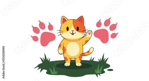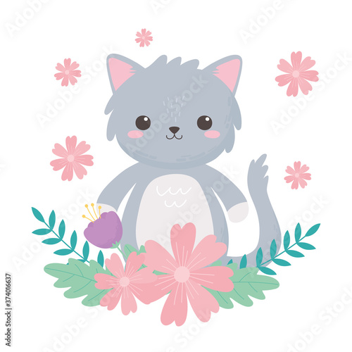 Cartoon cat vector. Cute animal icon for card design. Kitten character watering spring flower with can isolated illustration on white background