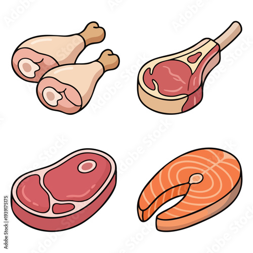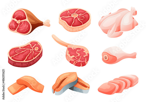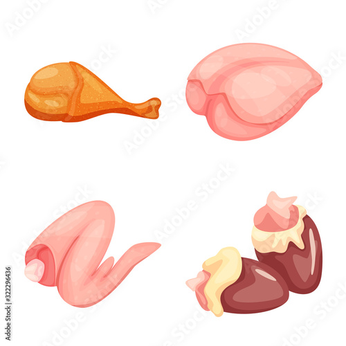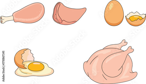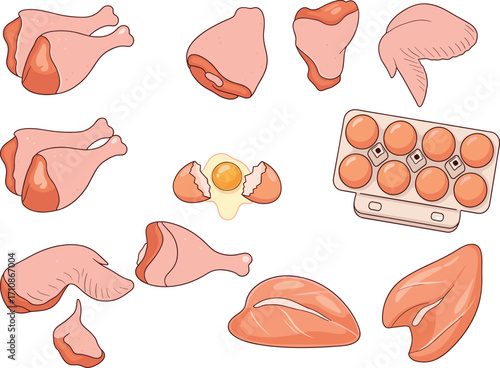 Cartoon chicken fresh raw meat vector set. Variety of uncooked poultry organic food for barbecue illustration. Whole hen, fillet, wings, sausages, eggs, drumstick isolated on white background