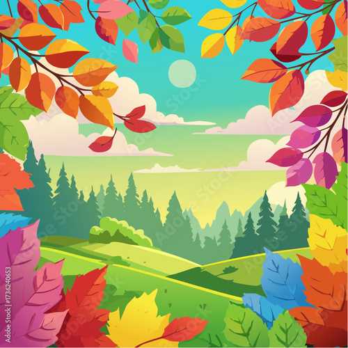 Cartoon garden field flat vector nature background. Meadow with green grass and yellow trees autumn scene. Scenic valley panorama. Gardening and ecology concept