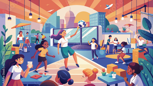 Cartoon children at school sport gym vector illustration. Sportive activity leisure games indoors. Teacher training with kids, boys and girls doing physical exercises, kicking ball, jumping on rope