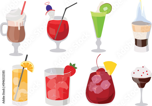 Cartoon tropical cocktails with ice and juice vector. Alcohol drink and non-alcoholic beverage isolated party set. Fresh aperitif icon for restaurant cocktail-hall menu illustration