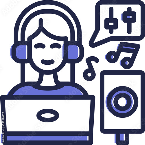 Cat dj vector. Cute kitten animal character in headphones standing at console playing melody icon isolated on white background